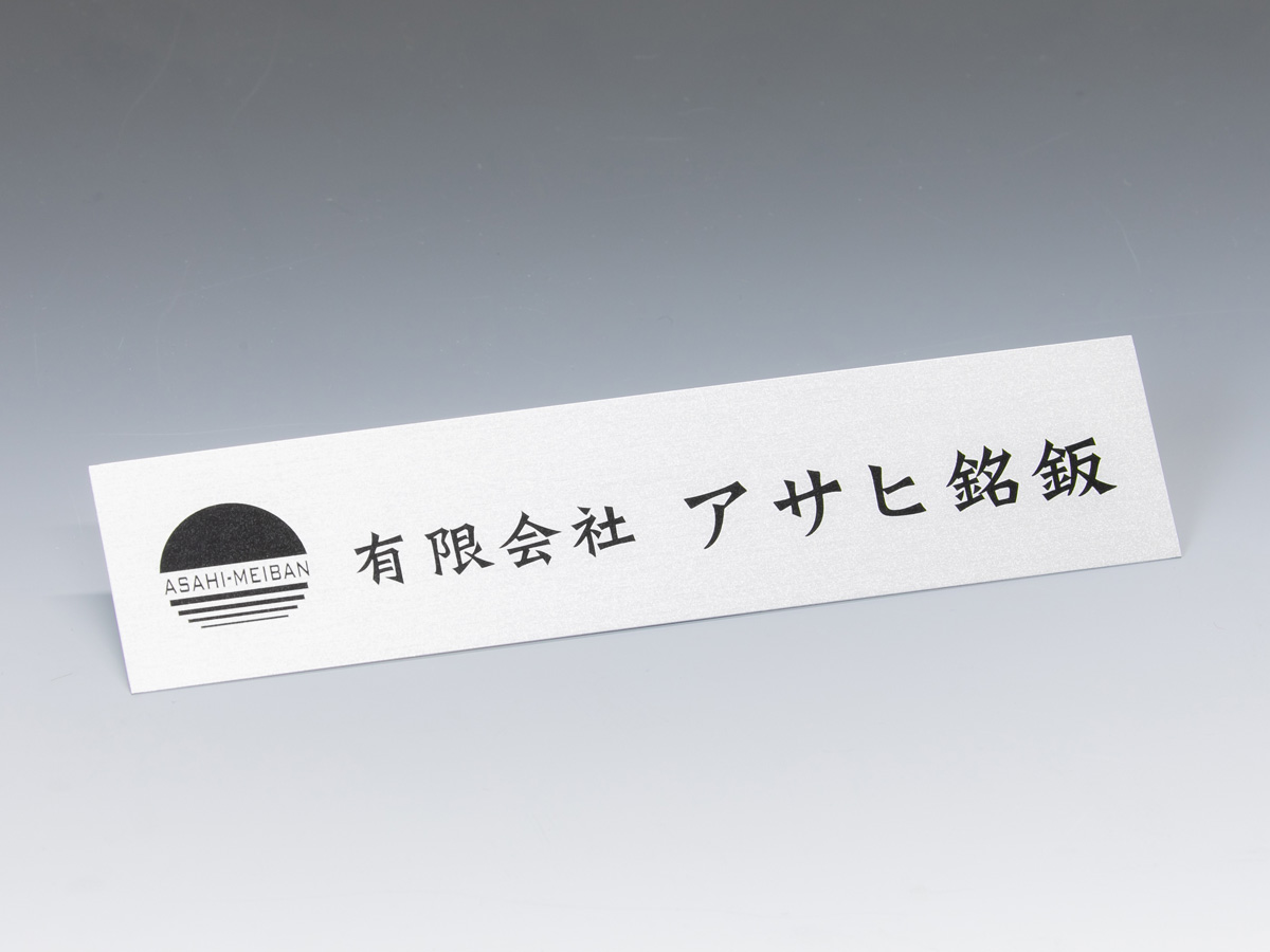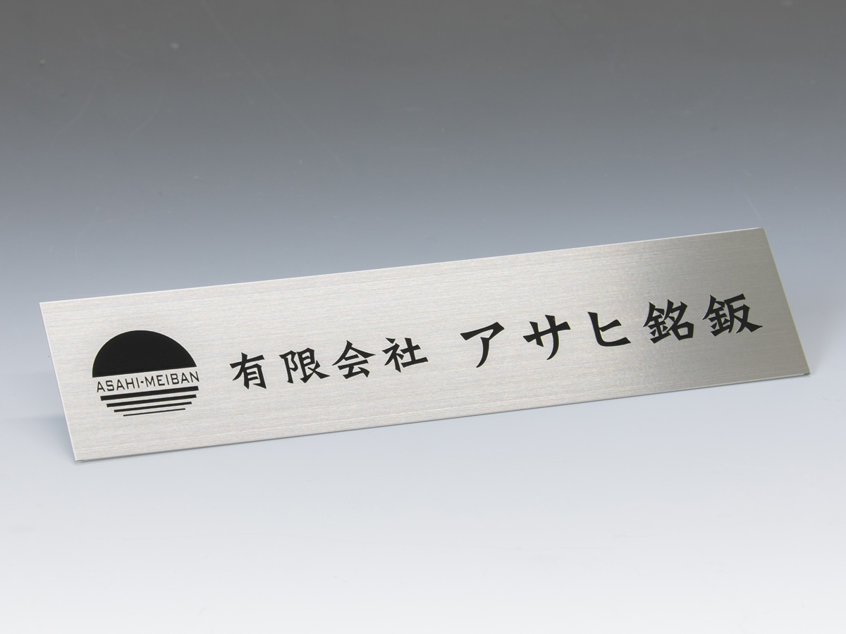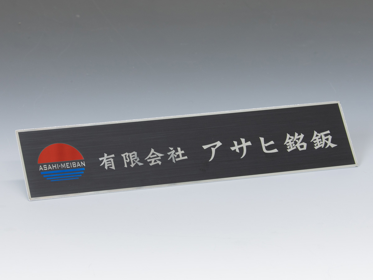 エッチングとは違い、アルミに染料を浸透させるため凹凸がなく緻密な文字・図形等が表現でき、金属感を生かした多彩な着色が得られます。また平滑でヨゴレが付きにくい特徴がありますが、耐候性が良くないので屋内使用に向いています。